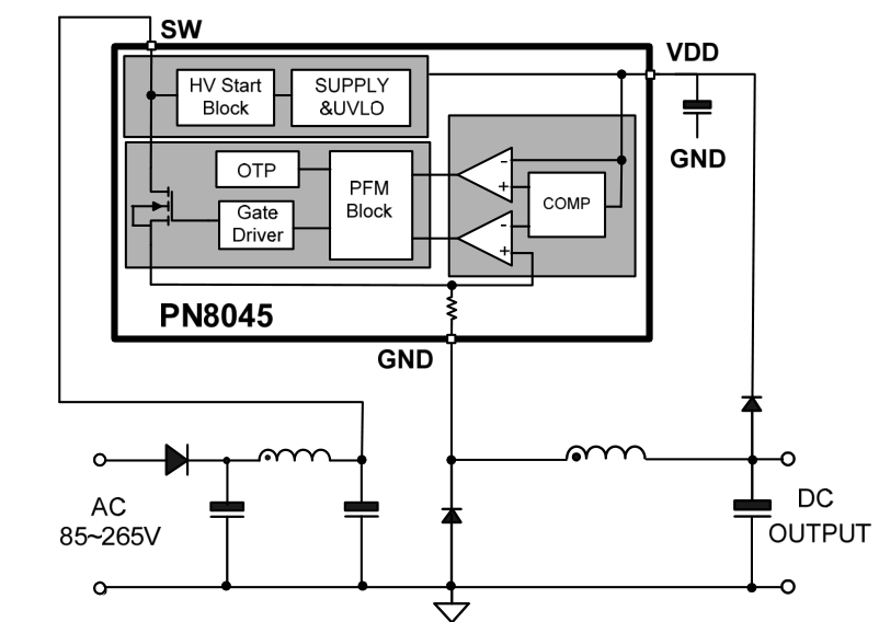 PN8045集成PFM控制器及650V高雪崩能力智能功率MOSFET,用于外围元器件较简的小功率非隔离开关电源。PN8045内置启动模块,实现系统启动、待机功能。该芯片提供了智能化?;すδ?,包括过载?;?,欠压保护,过温保护。另外PN8045的降频调制技术有助于EMI特性。