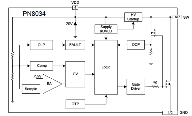 PN8034NSC-T1集成PFM控制器及650V高雪州能力智能功本MOSFET,用于外图元器件极精简的小功本非隔离开关电源。PN8034内置高压启动??椋迪窒低晨焖倨舳?,超低待机功能。该芯片提供了完整的智能化保护功能,包括过流?;?,欠压?;?,过温?;ぁA硗釶N8034的降频调制技术有助于改曾EMI特性。