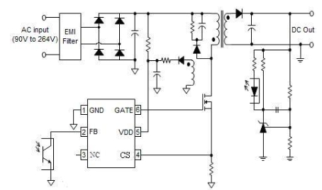 芯片通过对输出采样并反馈到光耦获得高精度的恒压输出。内置的斜串补偿电路确保了峰值电流??刂频奈榷ㄐ?。内部集成的频率抖动功能可以改善EMC.降低EMI滤波成本。