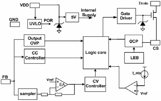 复合模式的应用使得芯片能够实现低静态功耗、低音频噪音、高效率。而且高集成的功率 MOSFET 能够降低外部 PCB的面积以及系统的成本。PL3327C 同时具有多种?;すδ埽褐鹬芷诜逯档缌骷觳?、欠压?;?、过压保护等。内部框架图如下所示