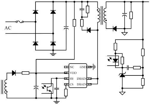 芯片通过对输出采样并反馈到光耦获得高精度的恒压输出。内置的斜率补偿电路确保了峰值电流??刂频奈榷ㄐ?。内部集成的频率抖动功能可以改善EMC,降低EMI滤波成本。