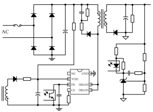 芯片通过对输出采样并反馈到光耦获得高精度的恒压输出。内置的斜率补偿电路确保了峰值电流??刂频奈榷ㄐ?。内部集成的频率抖动功能可以改善EMC,降低EMI滤波成本。