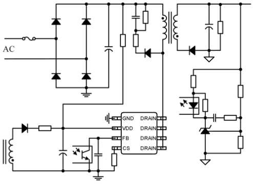 芯片通过对输出采样并反馈到光耦获得高精度的恒压输出。内置的斜率补偿电路确保了峰值电流??刂频奈榷ㄐ浴D诓考傻钠德识抖δ芸梢愿纳艵MC,降低EMI滤波成本。