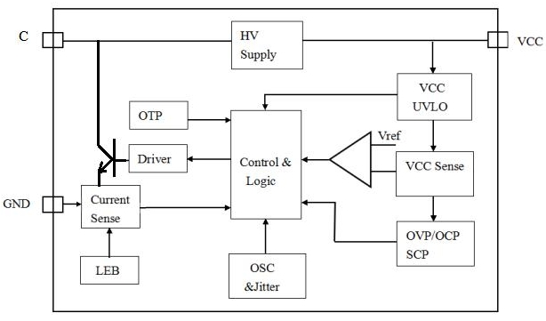 其内部集成了高压功率开关,采用专利电压电流控制技术,无需外部电压反馈和电流侦测电路即可实现精确的电压和电流调节,极大的方便客户使用。