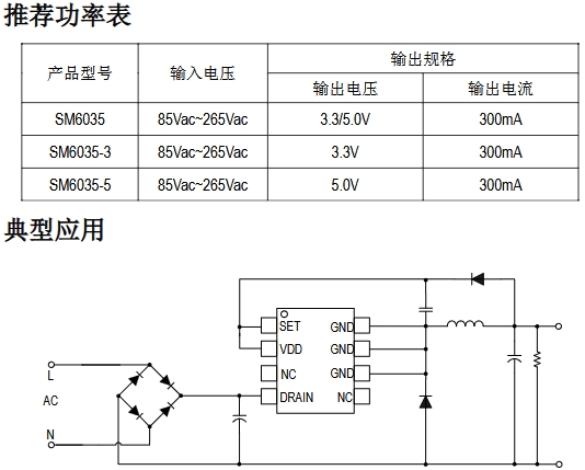SM6035-X 是一款高精度非隔离、高集成度且低成本的降压恒压控制芯片,适用于 85Vac~265Vac 全电压范围应用;SM6035-X 内部集成500V高压功率管,内置 CS 电阻,无需外部补偿元件,即可实现优异的线性调整率和负载调整率,外围元件极少,大大的降低了系统的成本,节约了PCB的尺寸。SM6035-X 应用于多种供电电源领域,提供3.3/5V 两种规格输出电压。同时芯片集成有完备的?;すδ?,过温保护、过压保护、欠压保护等,保证了系统的可靠性。