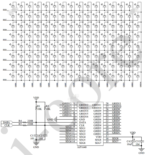 AiP1640是一种LED (发光二极管显示器)驱动控制专用电路,内部集成有MCU数字接口、数据锁存器、LED高压驱动等电路。本产品性能优良,质量可靠。主要应用于电子秤及小家电产品的显示屏驱动。
