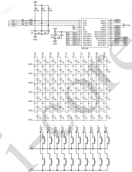 AiP1668是带键盘扫描接口的LED驱动控制专用电路,内部集成有MCU数字接口、数据锁存器、键盘扫描等电路。本产品主要应用于VCR、VCD、DVD及家庭影院等产品的显示屏驱动。