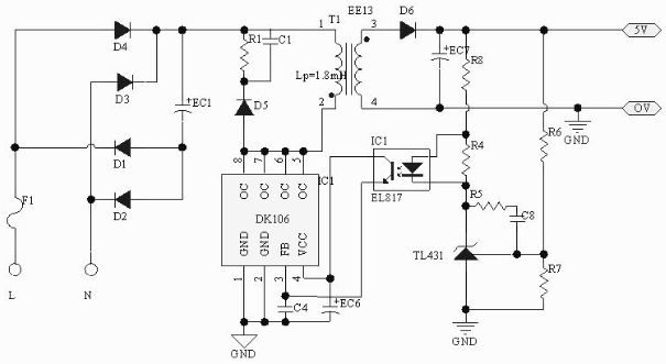DK106芯片是专用小功率开关电源控制芯片,广泛用于电源适配器、LED电源、电磁炉、 空调、DVD等小家