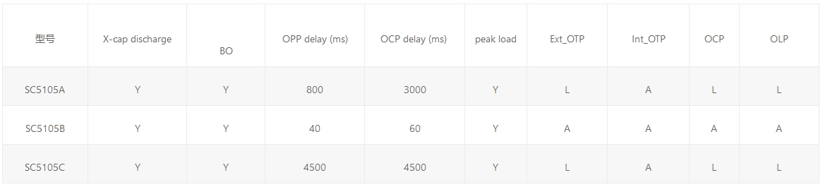 SC5105是一款集成高压启动与X-CAP放电功能的高性能电流模式PWM控制器,具有BO、OPP和OCP?;ず退拦δ?,提高了系统的安全性。为适应峰值负载,提供了峰值功率输出功能;高低压补偿技术减小了高低压OCP的差异;独特的频率抖动技术和GATE软驱动技术,改善了系统EMI性能。