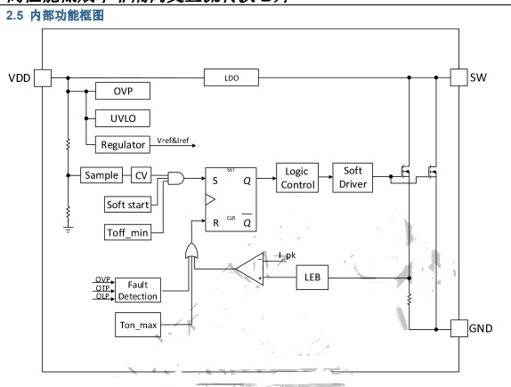 G2365X-15 内部集成了高压启动电路、电流采样电路、电压反馈回路。外部无需启动电阻、电流采样电阻和