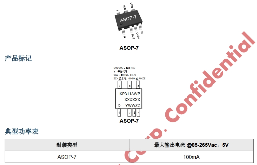KP311AWP是一款高性能、低成本的离线式PWM功率开关,适用于降压型和升降压型电路。它采用高压单晶圆工艺,集成有500V高压MOSFET和采用开关式峰值电流模式控制的控制器。这款芯片以其高精度的5V默认输出和超低待机功耗小于50mW而闻名。