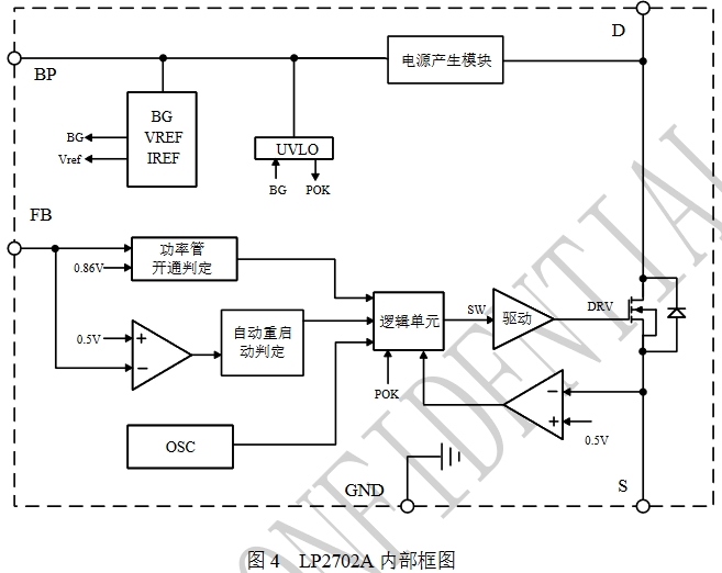为了确保电源的稳定性和安全性,LP2702A集成了多种保护功能,包括过压保护(OVP)、欠压保护(UVP)、过流保护(OCP)和短路?;?SCP)。