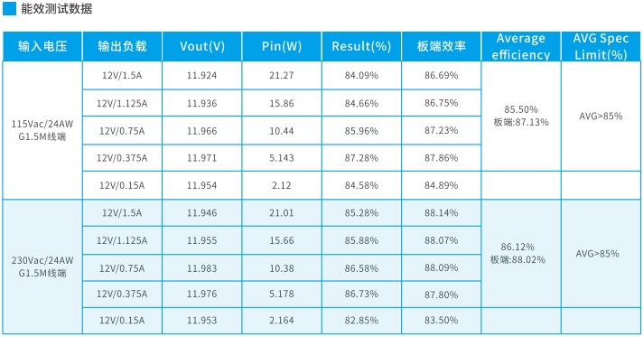 在230VAC输入下,12V1.5A输出时,效率最高可达88.99%,平均效率为88.09%。