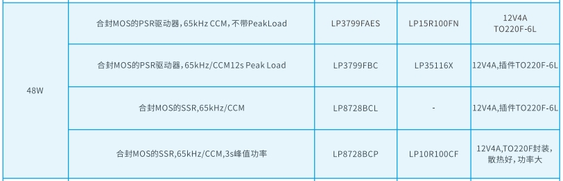 LP8728BCP:适用于65kHz/CCM的SSR驱动器,支持3秒峰值功率,与LP10R100CF搭配,提供12V4A的输出,具有优秀的散热性能和高功率输出能力。