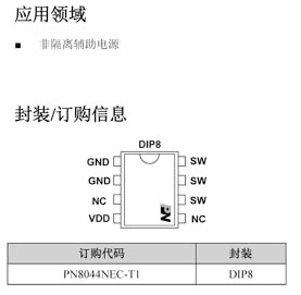 根据深圳三佛科技提供的资料,PN8044的后缀版本为"NEC-TI",这通常表示该芯片的封装类型和可能的一些特定特性。在这个例子中,"NEC"可能代表"Non-isolated Evaluation Configuration",而"TI"可能是指"Through Hole Insertion",即通孔插入式封装。封装信息显示,PN8044NEC-TI采用的是DIP8封装。