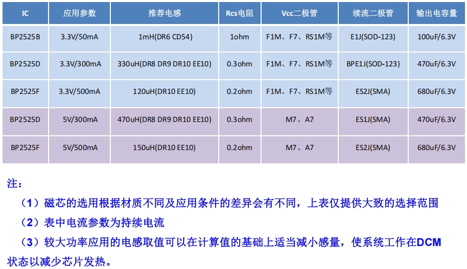 BP2525X芯片适用于多种应用场景,如3.3V/300mA和5V/300mA的WiFi应用。推荐电感、Rcs电阻、Vcc二极管、续流二极管和输出电容的具体参数,以及在不同负载下的待机功耗和满载效率数据,为设计者提供了宝贵的参考信息。