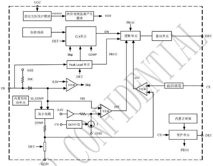 软启动功能:LP8776CD内置典型值9mS的软启动功能,通过在启动阶段逐周期增加VCS保护阈值的方式实现,有利于避免变压器的饱和和降低副边二极管的应力,从而提高耐压性能。